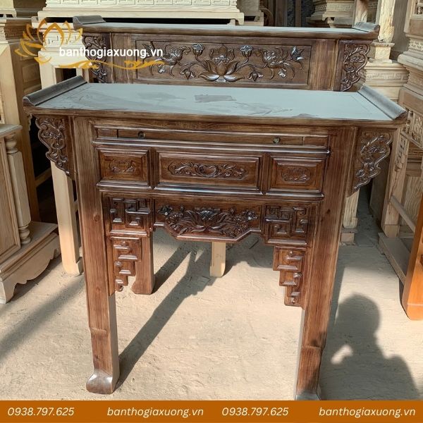 Được tập trung hoàn thiện một cách tỉ mỉ đến từng góc cạnh dù là nhỏ nhất để đem lại một sản phẩm tốt nhất. Bàn thờ được chia làm 2 tầng với kích thước riêng phù hợp với những mục đích sử dụng khác nhau nhằm đa dạng hóa công năng của sản phẩm. Phần rìa bàn thờ được thiết kế với thanh chắn cao bảo vệ các vật dụng thờ cúng như hương đèn, hoa quả, mâm đồ cúng tốt hơn trong suốt quá trình làm lễ.