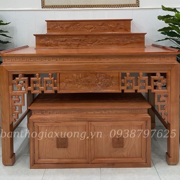 Bàn thờ gia tiên sử dụng gỗ sồi tự nhiên nguyên chất 100%. Mẫu bàn thờ được thiết kế khá đơn giản, không cầu kì nhưng vẫn toát lên sự sang trọng và đẹp mắt khi nhìn vào.