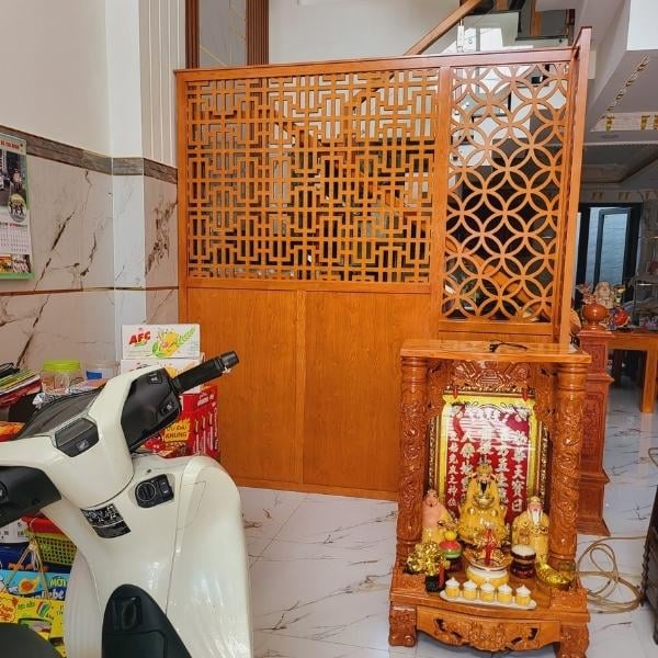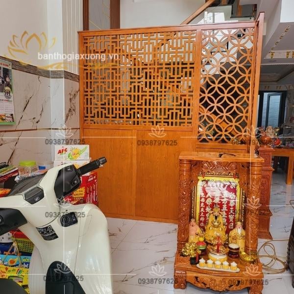 Thường được chế tác từ các chất liệu như gỗ, đá hoặc thậm chí kim loại, vách ngăn bàn thờ ông địa thể hiện sự kính trọng và sự tôn thờ đối với ông địa. Những chi tiết chạm trổ tinh xảo trên vách mang đến một diện mạo độc đáo và truyền thống.