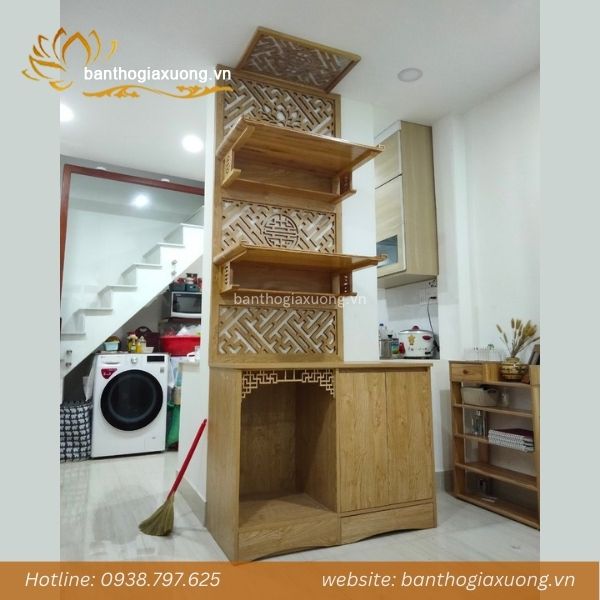 - Vách được làm từ gỗ ván MDF phủ melamine cao cấp với độ dày 17mm, khung bao dày 4cm đảm bảo độ dày dặn và chắc chắc để gia chủ treo trang thờ.